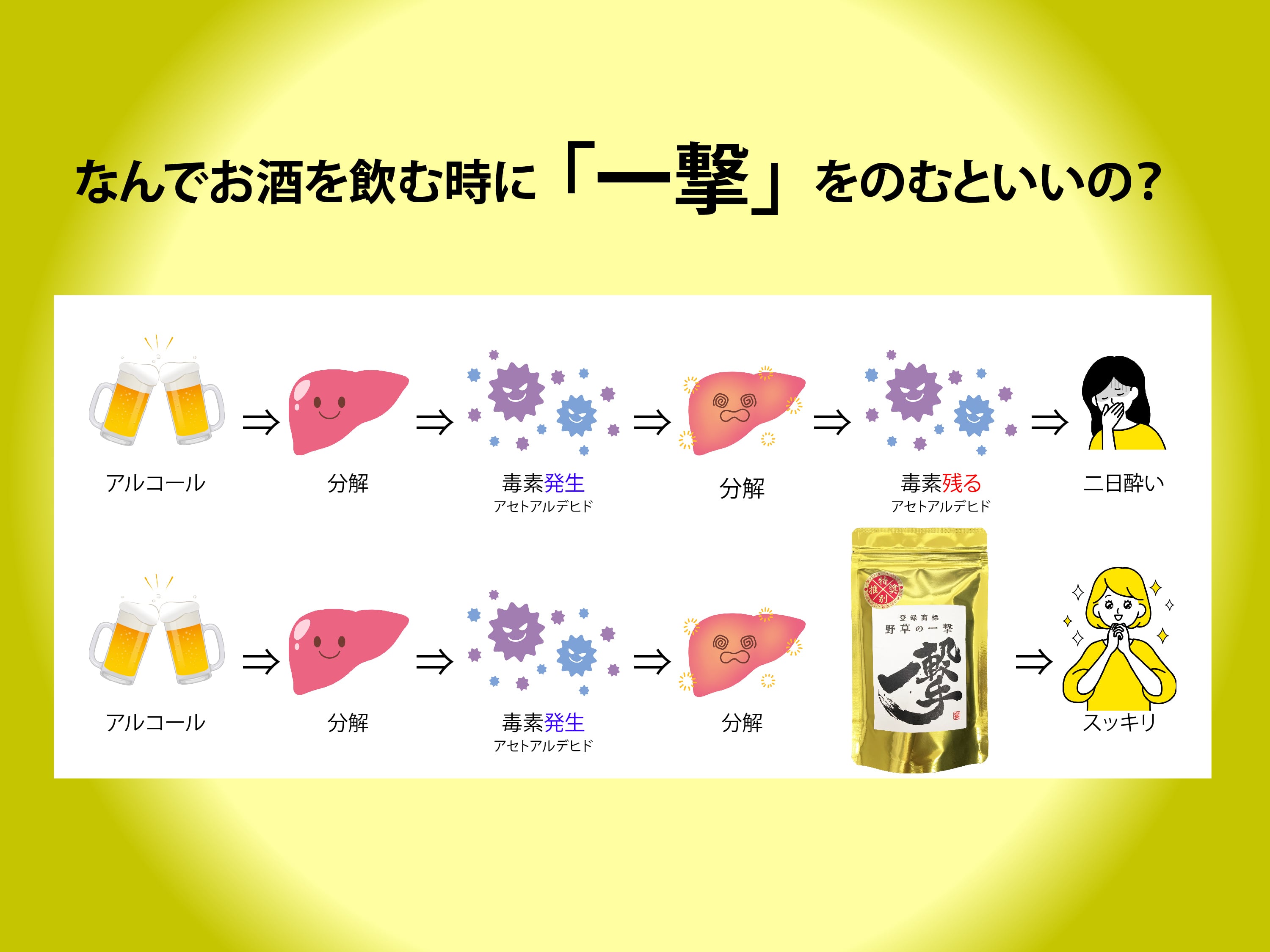国産野草の⼒で、悪酔いと⼆⽇酔いを撃退!お酒を愛するビジネスマンの必需品です。
